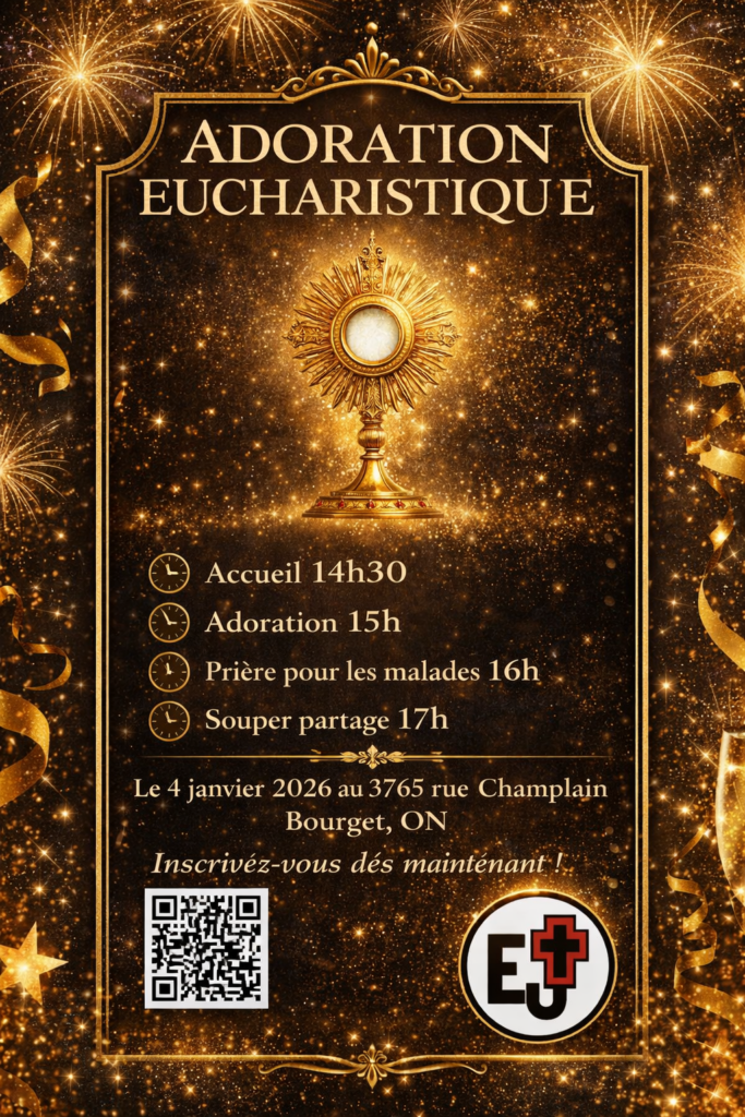 Adoration eucharistique et prière pour les malades suivi d'un souper partage. Animation de retraite et de louange avec d'autres groupes à travers le Canada français.